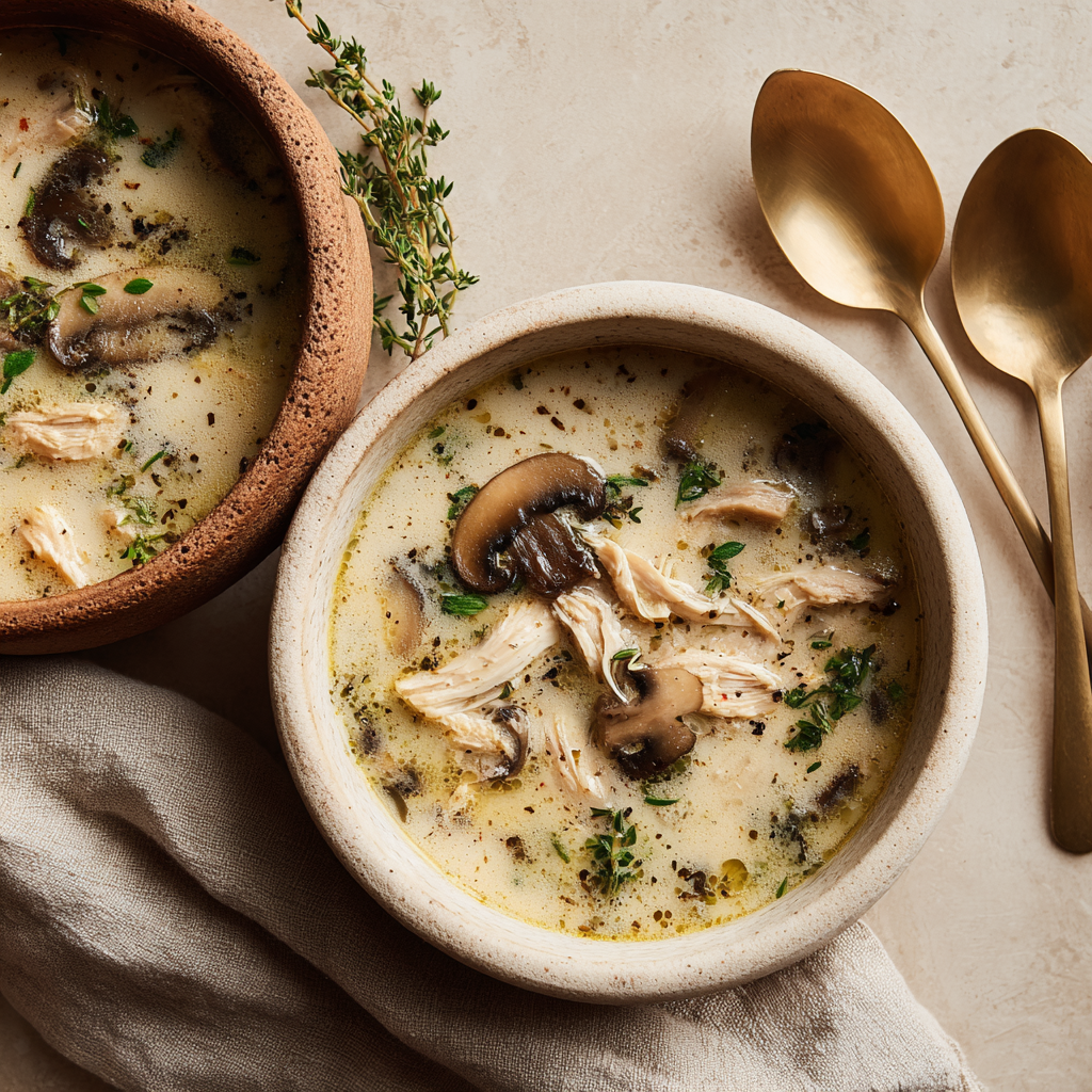 Herzhaft-cremige Hähnchen-Pilzsuppe mit Rotisserie-Hähnchen