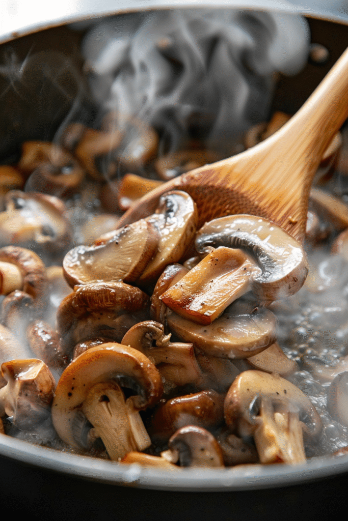 Pilze hinzufügen und braten, bis sie weich sind und leicht Farbe bekommen.